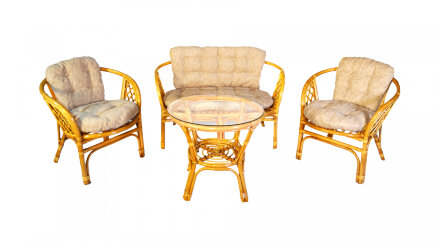 Комплект из натурального ротанга, состоящий из дивана, двух кресел и круглого столика со стеклом.