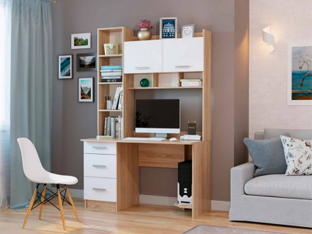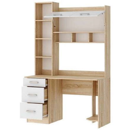 Письменно-компьютерный стол ПКС-5 с 3-мя ящиками на роликовых направляющих и нишей для системного блока. Для удобства открывания и удержания фасадов в открытом положении устанавливаются газлифты. Крышка стола обработана 1-мм кромкой, что делает работу за столом более комфортной и удобной. Рабочая зона стола 902 х 540 х 584 мм.
